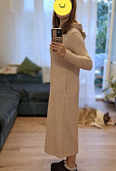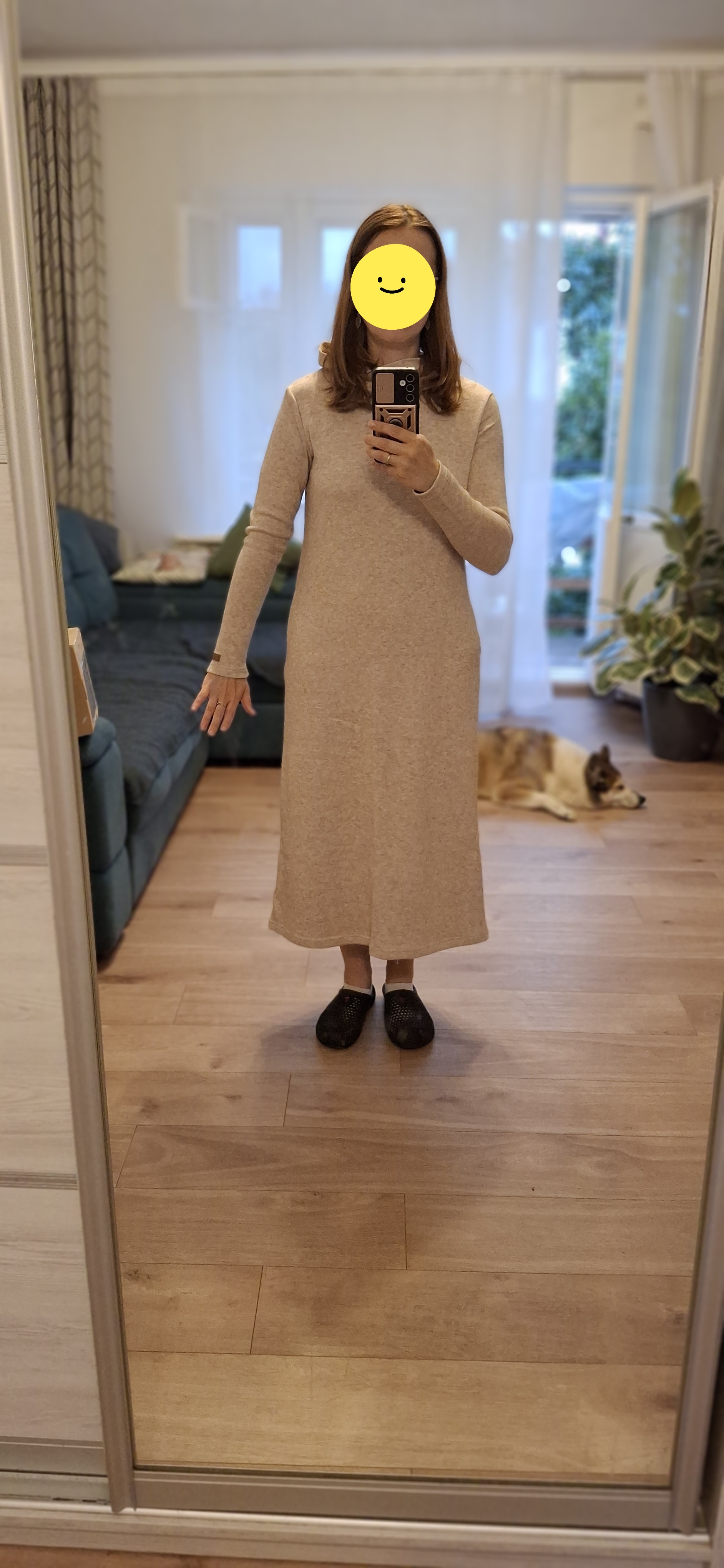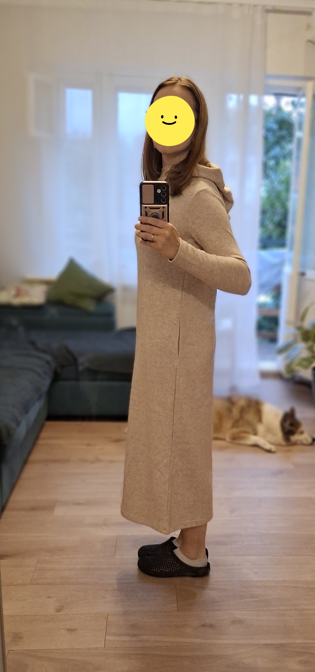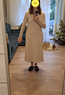Платье очень лёгкое, тёплое, а самое главное - ну очень приятное к телу, носила весной до 17 градусов было комфортно. Купила размер ХS (ог-85,от-65,об-95),хотя большинство вещей этой фирмы ношу S, правильно сделала, село здорово, рукава очень порадовали- нормальной длины, после стирки платье не деформировалось.