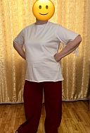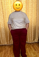 Рост - 162 смс., ОТ - 108 см., ОБ - 112 см. Размер XL сел как влитой! Ткань приятная, мягкая, впитывает влагу, аллергии не вызывает. Брюки широкие, украшают фигуру. Нижний срез штанин не обработан, что делает модель интереснее. Удобны, комфортны в носке!