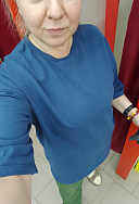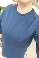 Футболка отличная, ткань плотная, швы безупречные. Горловина обработана изнутри по спинке кантом, чтоб не растягивалась. Удлинённая, красивый цвет.