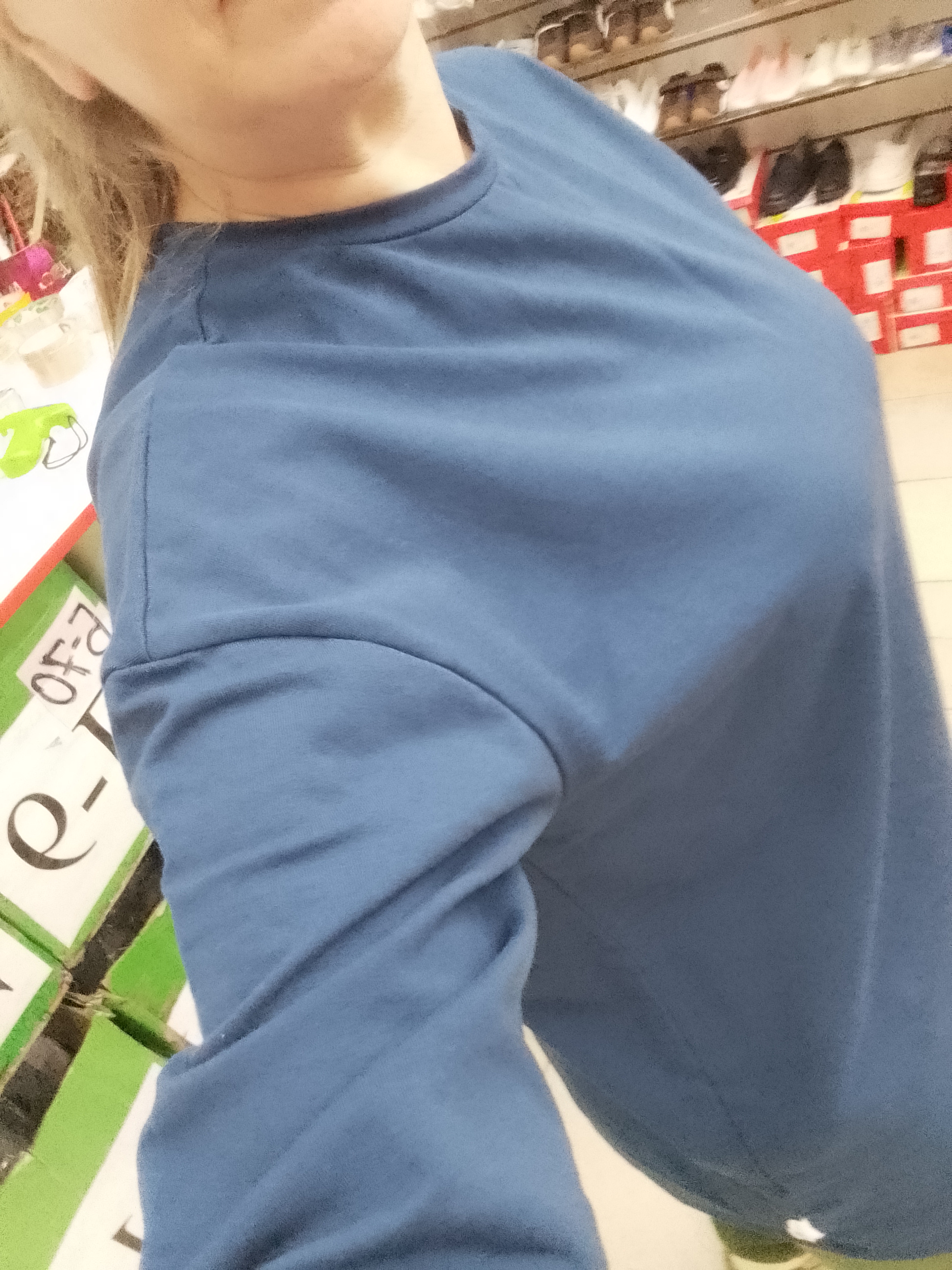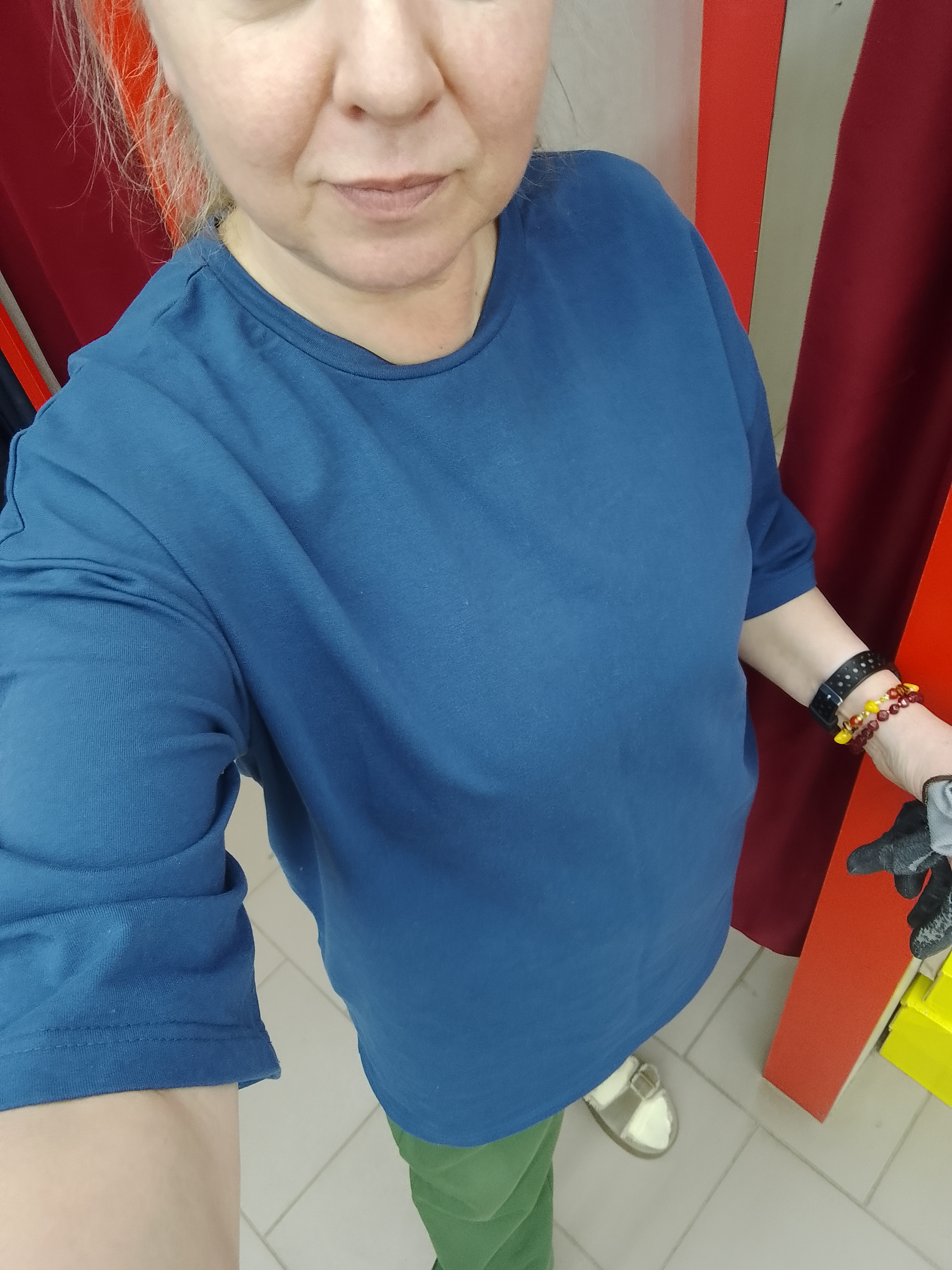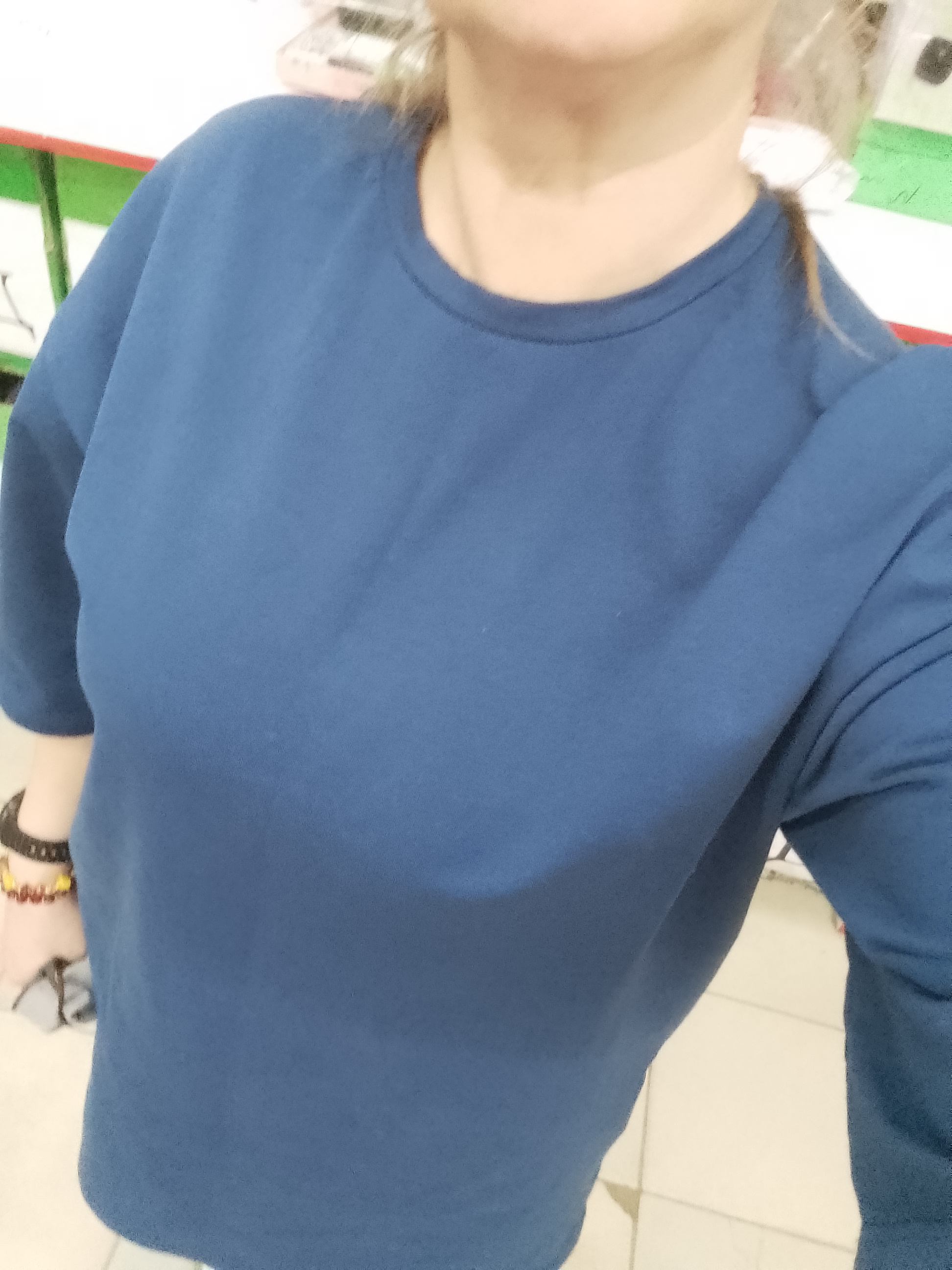 Футболка пришла с браком. Рукав смотрелся как фонарик с такой сборкой. Поначалу расстроилась, представила сколько времени займёт возврат/обмен. Но очень уж понравилась мне эта футболка, поэтому исправила этот небольшой недочёт сама. Цвет шикарный, ткань плотная и приятная к телу. На ог 90 и рост 173 сидит свободно, первый раз ношу такой овер, очень нравится! Классно смотрится с легинсами.