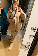 Невероятно тёплый костюм! Толстовку и джоггеры брала по отдельности. Джогеры размера XL. По совету менеджера, взяла толстовку XS-S, потом очень переживала, что будут коротки рукава, но как видно по фото, всё хорошо, я не хотела очень оверсайз. Порадовало, что кнопки не тугие и капюшон удобный, не большой. Мои размеры: ОГ 92, ОТ 80, ОБ 106,рост 169. (руки длинные)