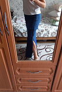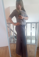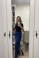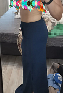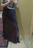 Юбочка понравилась, на мой рост 158 ожидаемо длинная, лежит на полу, буду укорачивать. Разрез только с одной стороны, с правой. На фото померила с топом от костюма moon.