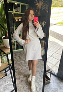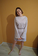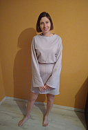 Двойственное впечатление от платья, думала оставить или нет, в итоге решила оставить. По сути это длинная футболка с рукавами, и смотрится она примерно также. Юбка идеально сидит, а вот верх хотелось бы не такой широкий, так как на модели он таким широким не выглядит. Как будто футболку оверсайз заправили в юбку. Возможно, стоило заказать на размер меньше, но отправлять и снова ждать пошива и отправки сил нет, это ещё два месяца, лето закончится. В целом приятная ткань и цвет приятный, можно и с кроссовками носить, и с туфлями на каблуке. Качество пошива очень хорошее