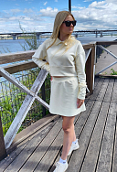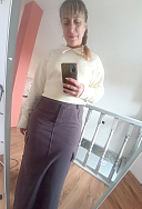 Костюм очень понравился, правда, не ожидала, что ткань такая плотная, однозначно на осень. Свитшот отлично сидит, очень понравились длинные рукава и воротничок, приятный к телу материал. Крой у него не прямой, а суженый книзу, но так даже лучше, отлично смотрится с юбкой-шортами. Мой рост 165 см, ОГ 85. Очень хотелось бы знать, как свитшот смотрится с брюками реформ