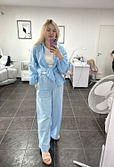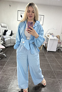 Взяла костюм, очень стильно смотрится, свободный, но не сильно, на грудь 96, рост 172, вес 60, Взяла s. Не пожалела, очень отлично сел. Цвет нежный голубой, телефон не передаёт к сожалению, очень красивый на лето необходим