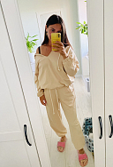 Фото сделано сразу же как только получила посылку и примерила, поэтому слегка помятый. В реале костюмчик бежевый, фото из-за холодного света искажает цветопередачу. Купила джогерры и худи и получился костюмчик - прям топчик! Очень мне понравился, хотя были сомнения в покупке, но похоже он станет одним из любимчиков!))